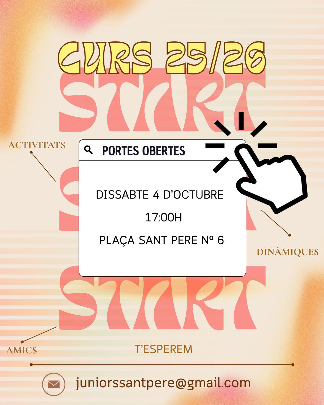 El pròxim dissabte 4 d’octubre tornem a obrir les portes del Centre Juniors Sant Pere per donar inici a un nou curs ple d’energia i noves experiències.